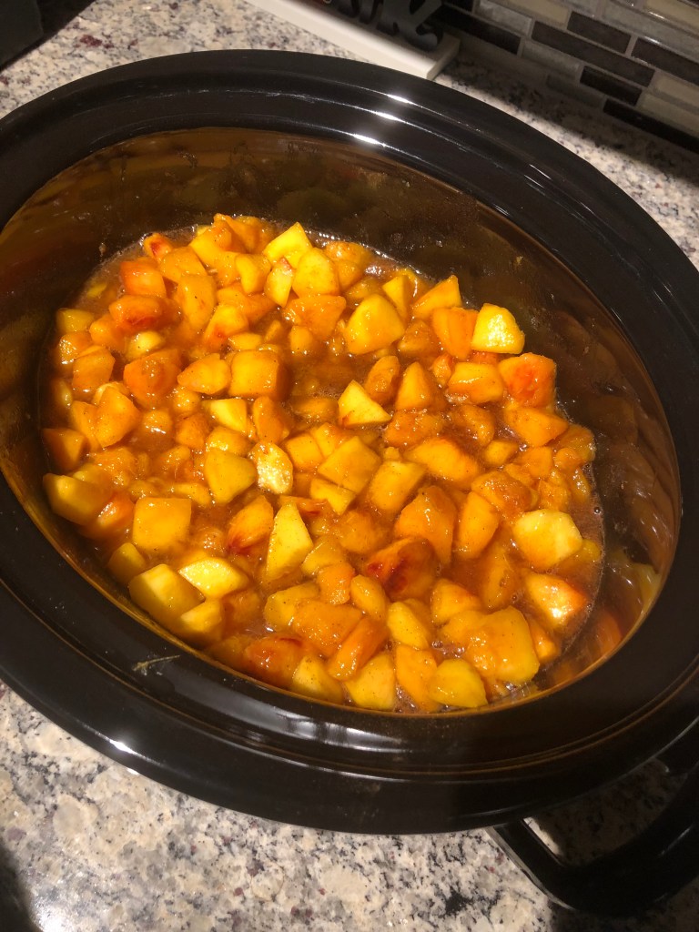 This past weekend my boyfriend and I got peaches… and I mean A LOT of peaches. After making this peach butter, other treats, and giving some away; we still have a half a box of peaches! I haven’t ever tried or made peach butter but the premise would be the same as making any other fruit butter (i.e. apple butter). The fruit pieces need to be cooked long enough that when blended, it creates a smooth velvety texture. I’ve been super busy lately so the idea of making this in a crockpot was extremely appealing. I prepped it and let it cook overnight in the crockpot and in the morning it blended like a dream. Plus, we woke up to the smell of peaches and spices (drooling now just thinking about it).
