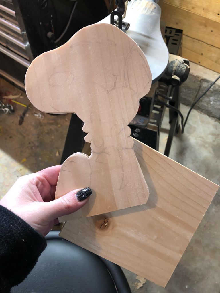If you’ve been following the blog for a bit, you’ll remember I had made a wooden HOME sign with the “O” being removable. This allows me to add a seasonal shape to our front entryway for holidays without always creating a whole new sign! I knew I wanted a cartoon character as my base so when I found this picture of cute Snoopy holding a heart, it was meant to be. Overall the hardest thing about doing a character like this is that everyone knows what Snoopy looks like. Getting details right are so important for a well-known character. To make it even harder; after my initial sketch out for the outline and details, the first white paint layer lost all my sketched details and I was now hand painting Snoopy’s eyes, mouth, ears, and toes!