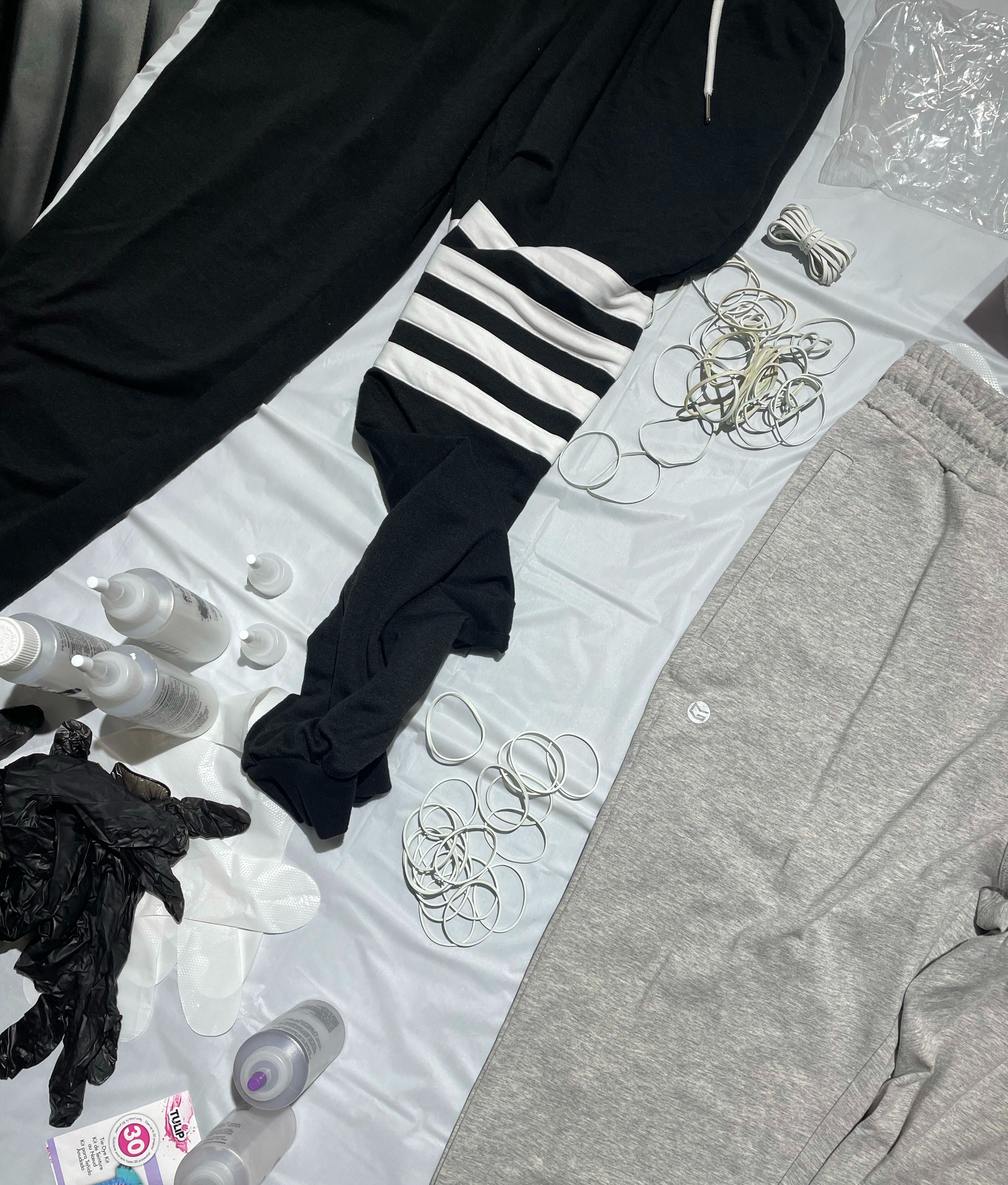 Find yourself a best friend who is as excited as you to get coffee from Starbucks and spend the night making tie dye sweatpants! For real, how lucky am I to have her as my best friend and maid of honor?! Although the best base to apply color is white, I was concerned about how see through a pair of white sweatpants would be. Instead I opted for a pair of light grey jogger sweatpants. Meanwhile, my friend decided to do a second take of tie dye. She chose to reverse tie dye a pair of black sweatpants.