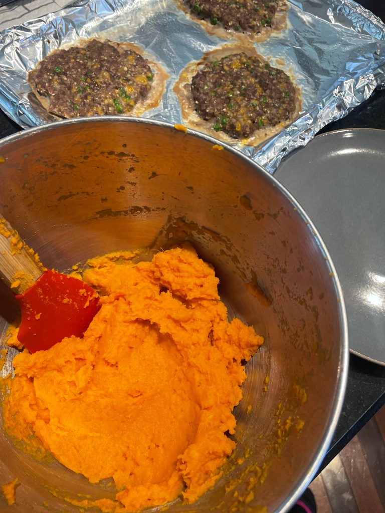 Allow both the meat and the sweet potato “frosting” to cool slightly before assembling.